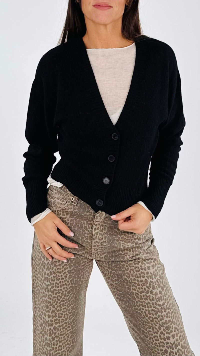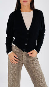 Cardigan in lana cachemire smacchinato a maglia piana integrale con profonda scollatura a V a costina come il fascione sul fondo. Alto polso a costina, vestibilità asciutta e corta in vita.