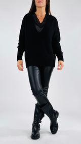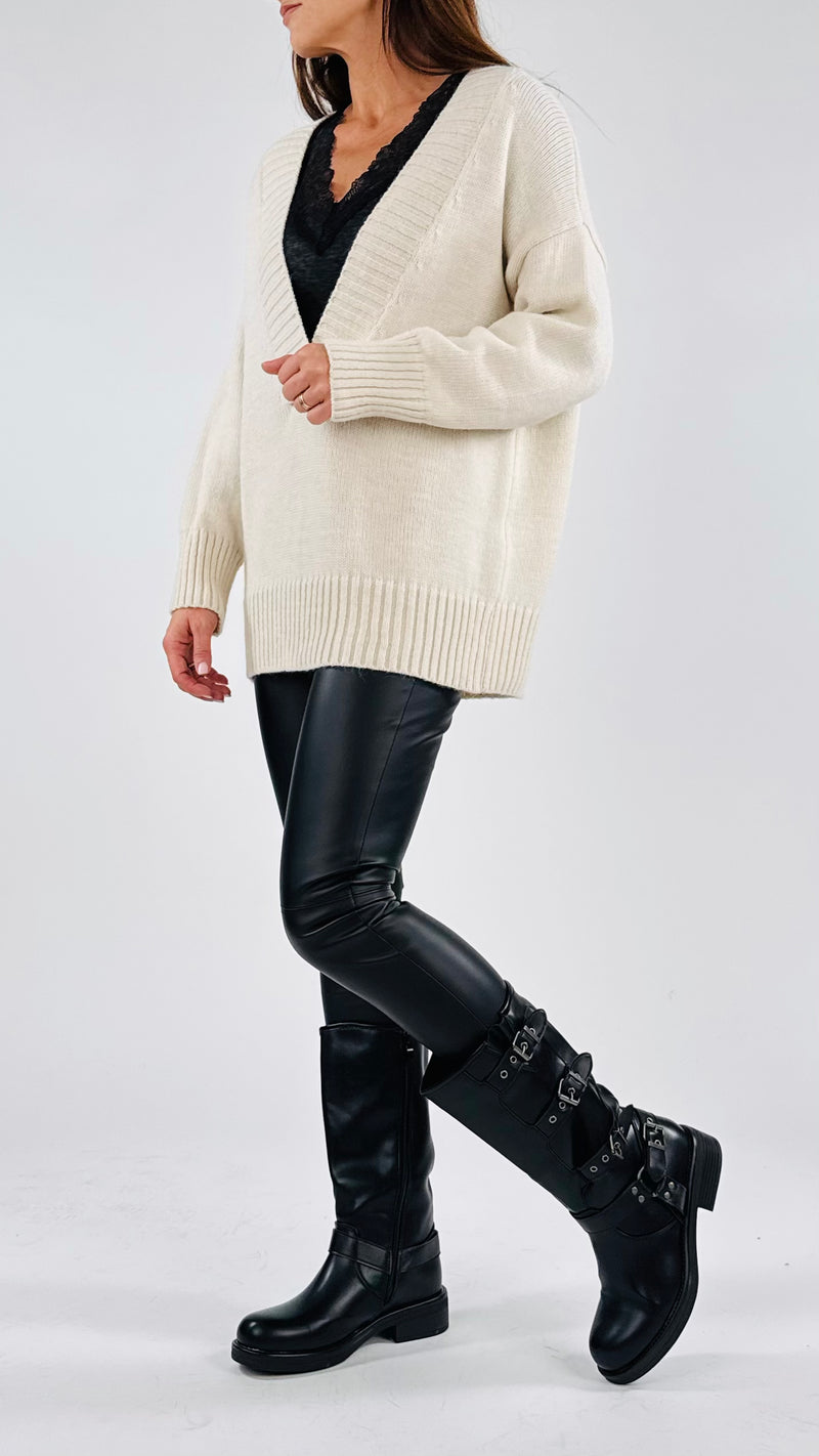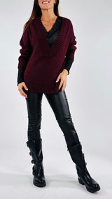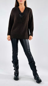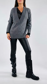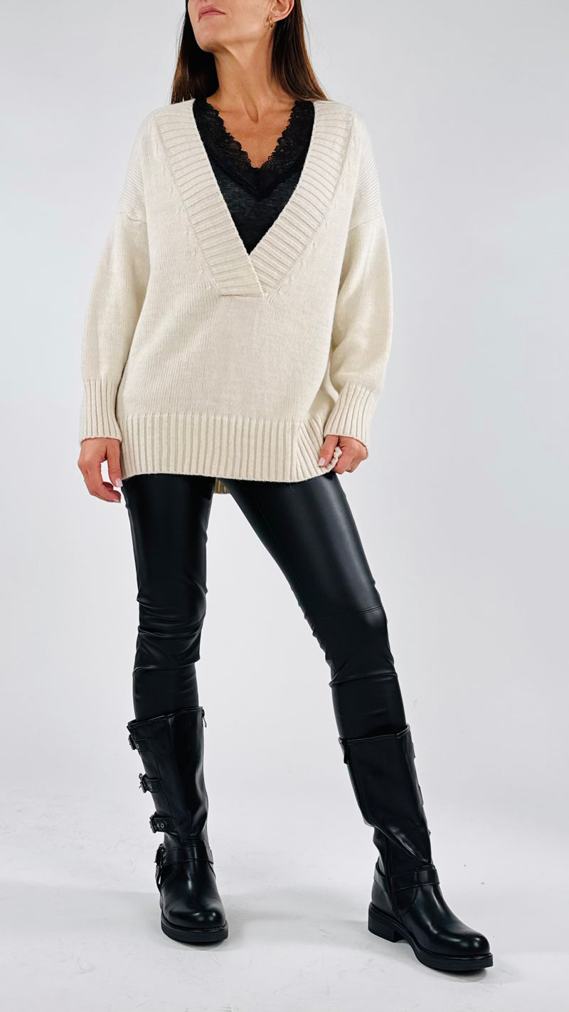 Pull in lana alpaca smacchinato a maglia piana con profonda scollatura a V sul davanti, giro sceso e manica con polso alto rifinito a costina larga come la scollatura ed il fascione alto sul fondo. Vestiblità morbida, lunghezza oltre la vita.